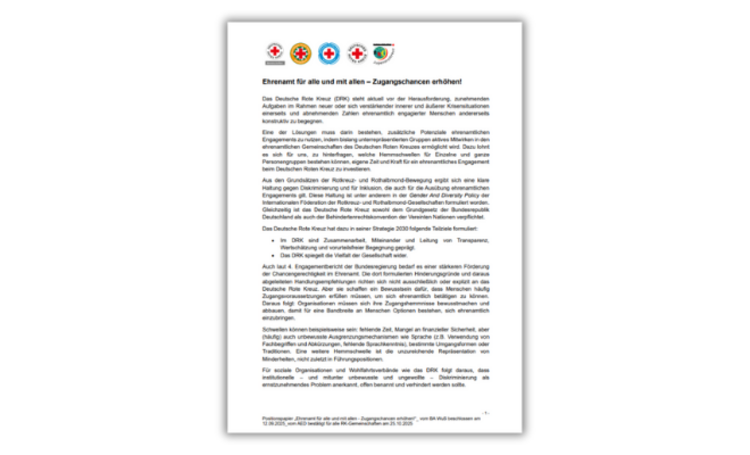 Das Positionspapier „Ehrenamt für alle und mit allen – Zugangschancen erhöhen!“ zeigt, wie das Deutsche Rote Kreuz Barrieren im Ehrenamt abbaut. Ziel ist, in allen Ortsvereinen, Kreis- und Landesverbänden Vielfalt und Inklusion zu stärken, damit Menschen unabhängig von Herkunft, Geschlecht, Religion oder Beeinträchtigung mitwirken können. Ehrenamtliches Engagement schafft Gemeinschaft, Selbstvertrauen und Mitgestaltungsmöglichkeiten.