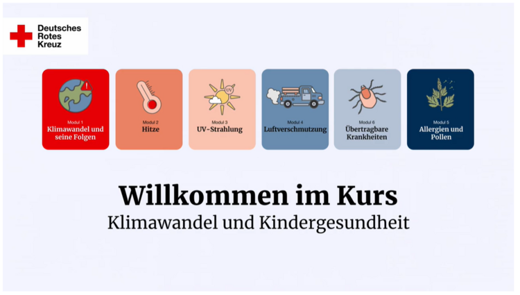 In sechs spannenden Modulen vermittelt der neue Kurs auf der DRK-Lernplattform Wissen über klimabedingte Gesundheitsrisiken für Kinder – von Hitze und UV-Strahlung über Allergien bis Zecken.
