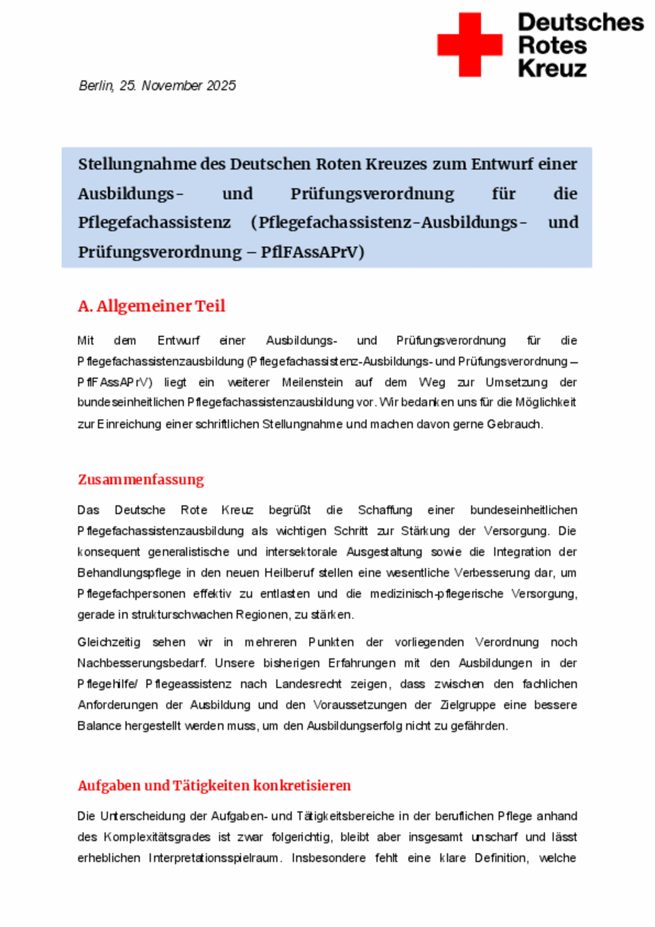 Mit dem Entwurf einer Ausbildungs- und Prüfungsverordnung für die Pflegefachassistenzausbildung (Pflegefachassistenz-Ausbildungs- und Prüfungsverordnung – PflFAssAPrV) liegt ein weiterer Meilenstein auf dem Weg zur Umsetzung der bundeseinheitlichen Pflegefachassistenzausbildung vor. Wir bedanken uns für die Möglichkeit zur Einreichung einer schriftlichen Stellungnahme und machen davon gerne Gebrauch.