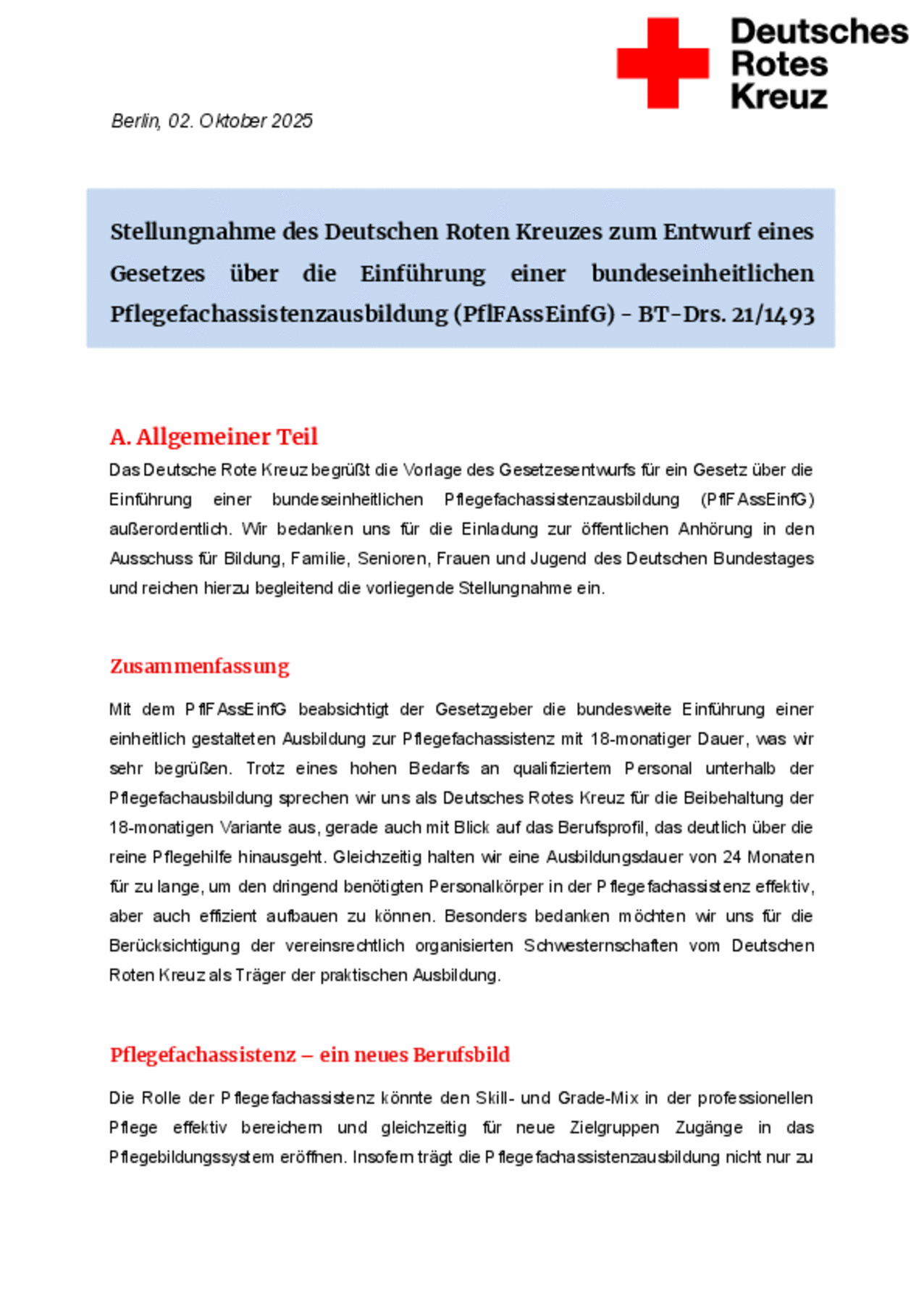 Das Deutsche Rote Kreuz begrüßt die Vorlage des Gesetzesentwurfs für ein Gesetz über die Einführung einer bundeseinheitlichen Pflegefachassistenzausbildung (PflFAssEinfG) außerordentlich. Wir bedanken uns für die Einladung zur öffentlichen Anhörung in den Ausschuss für Bildung, Familie, Senioren, Frauen und Jugend des Deutschen Bundestages und reichen hierzu begleitend die vorliegende Stellungnahme ein.