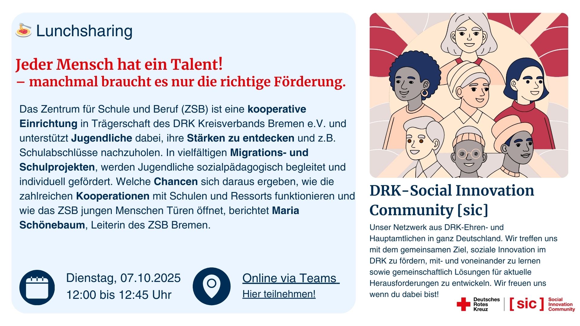 Das Zentrum für Schule und Beruf (ZSB) ist eine kooperative Einrichtung in Trägerschaft des DRK Kreisverbands Bremen e.V. und unterstützt Jugendliche dabei, ihre Stärken zu entdecken und z.B. Schulabschlüsse nachzuholen. In vielfältigen Migrations- und Schulprojekten, werden Jugendliche sozialpädagogisch begleitet und individuell gefördert. Welche Chancen sich daraus ergeben, wie die zahlreichen Kooperationen mit Schulen und Ressorts funktionieren und wie das ZSB jungen Menschen Türen öffnet, berichtet Maria Schönebaum, Leiterin des ZSB Bremen.