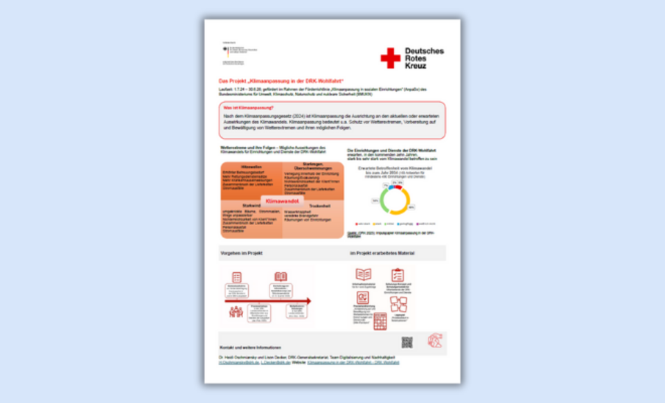 In dem Projekt „Klimaanpassung in der DRK-Wohlfahrt“ geht es um Maßnahmen zur Vorbereitung auf und Bewältigung von Wetterextremen und ihren Folgen. Soziale Einrichtungen und Dienste sollen mit den im Projekt erarbeiteten Maßnahmen bei der Bewältigung der Folgen der Klimakrise unterstützt werden. Dabei steht besonders die Langzeitpflege im Fokus.