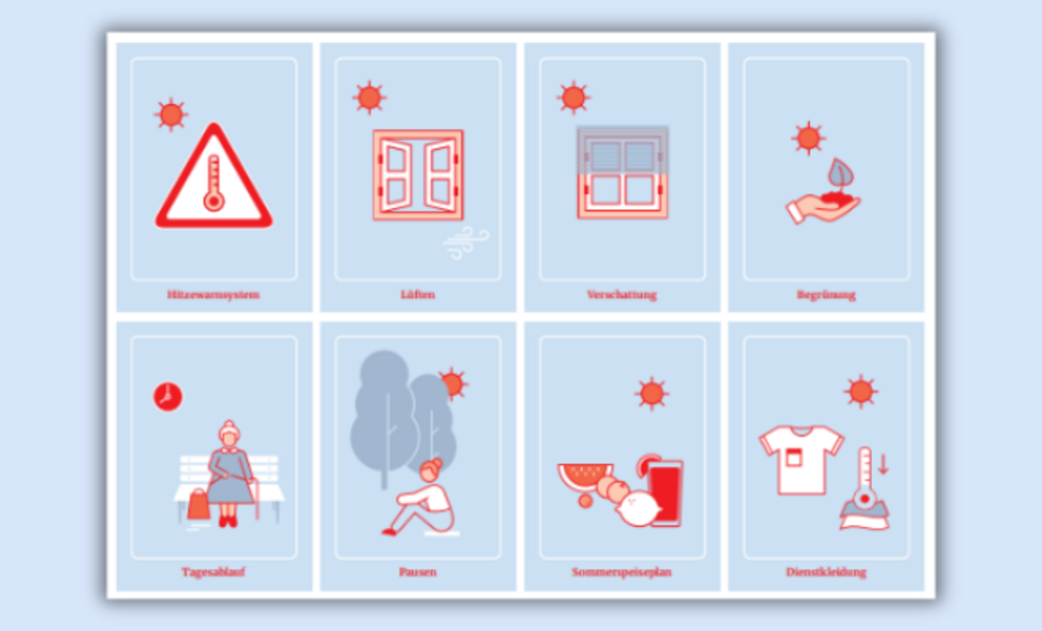 Für Mitarbeitende in stationären Pflegeeinrichtungen und ambulanten Pflegediensten stellen Klimafolgen wie Hitzewellen eine enorme Belastung dar, die ihre Leistungsfähigkeit beeinträchtigen können. Um pflegebedürftige Menschen auch in solchen Wetterextremen gut versorgen zu können, ist es wichtig, dass Pflegeeinrichtungen und -dienste befähigt werden, eigenständig niedrigschwellige Anpassungsmaßnahmen vornehmen zu können.