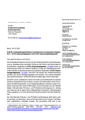 Das reformierte Gemeinsame Europäische Asylsystem (GEAS) gilt ab 12. Juni 2026. Für das Zusammenspiel europäischer und nationaler Regelungen sind Änderungen im Asyl- und Aufenthaltsrecht notwendig. In der Stellungnahme zum Entwurf des GEAS-Anpassungsgesetzes (BT-Drucksache 21/1848) äußert das DRK Besorgnis über weitreichende Freiheitsbeschränkungen und -entziehungen von Asylsuchenden.